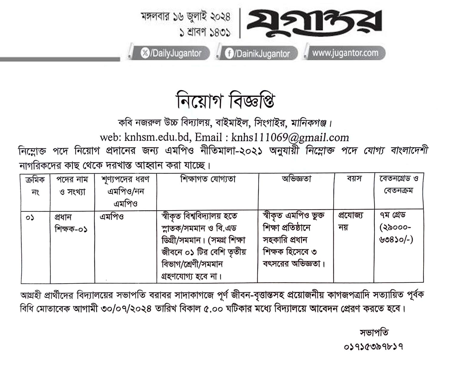 প্রধান শিক্ষক নিয়োগ বিজ্ঞপ্তি (১৬ জুলাই, ২০২৪ । দৈনিক যুগান্তর)