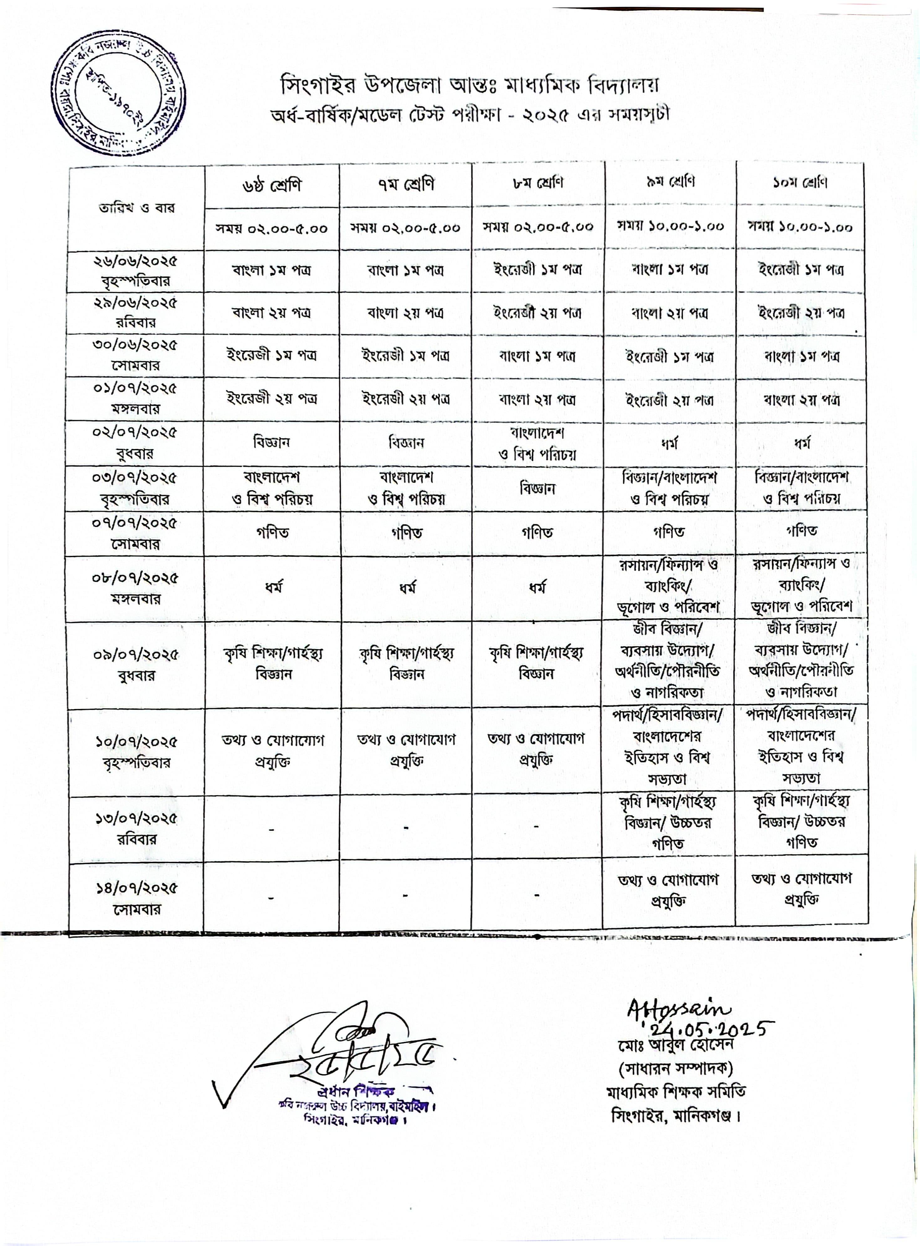 সিংগাইর উপজেলা আন্তঃ মাধ্যমিক বিদ্যালয় অর্ধ-বার্ষিক / মডেল টেস্ট পরীক্ষার সময়সূচি ২০২৫খ্রি.